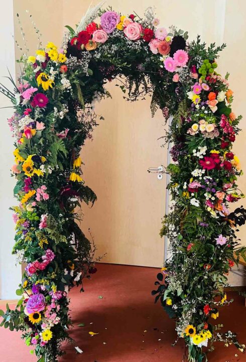 Die Eltern hatten mit viel Liebe und Mühe am Dienstagabend den Blumenbogen und die Bühne für die Kinder feierlich geschmückt. So viele bunte Blumen überall, wunderschön!