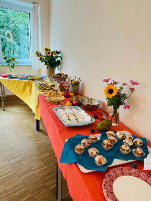 Als die 1. Klasse anschließend ihr Klassenzimmer kennenlernen durfte, wurden wir Eltern zum Buffet in die Malve (unsere Mensa) eingeladen. Herzlichen Dank an die Eltern der 2. Klasse für eure hervorragende Bewirtung!